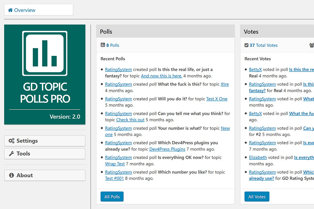 | Static | www.dev4press.com | https://www.dev4press.com/plugins/gd-topic-polls/ | forms/content-dashboard-pro.php:39 | 11/17/2025, 10:54:59 AM |